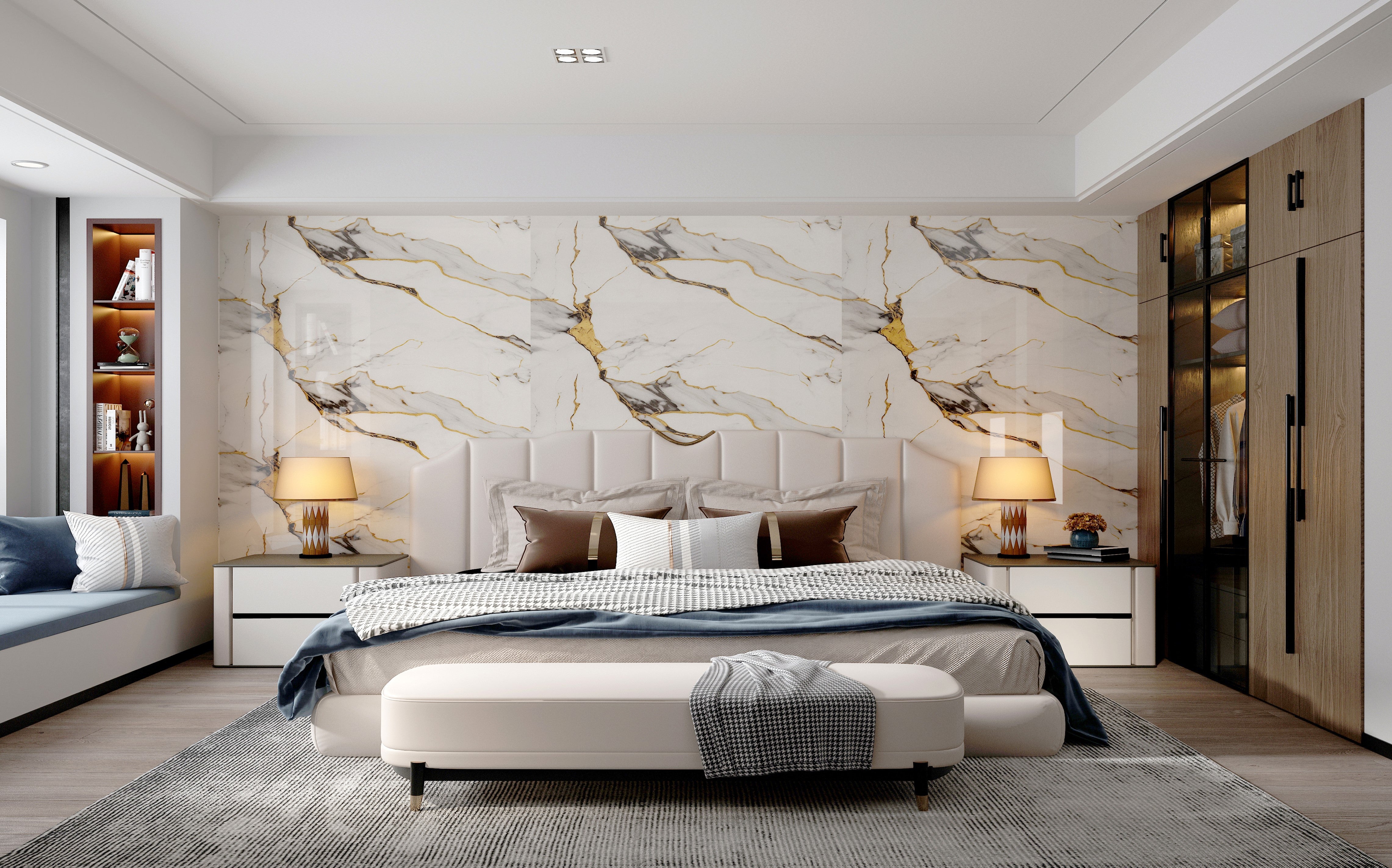 Бял мрамор с широки, драматични златни жили – ефект лукс за спални, дневни и витрини.
