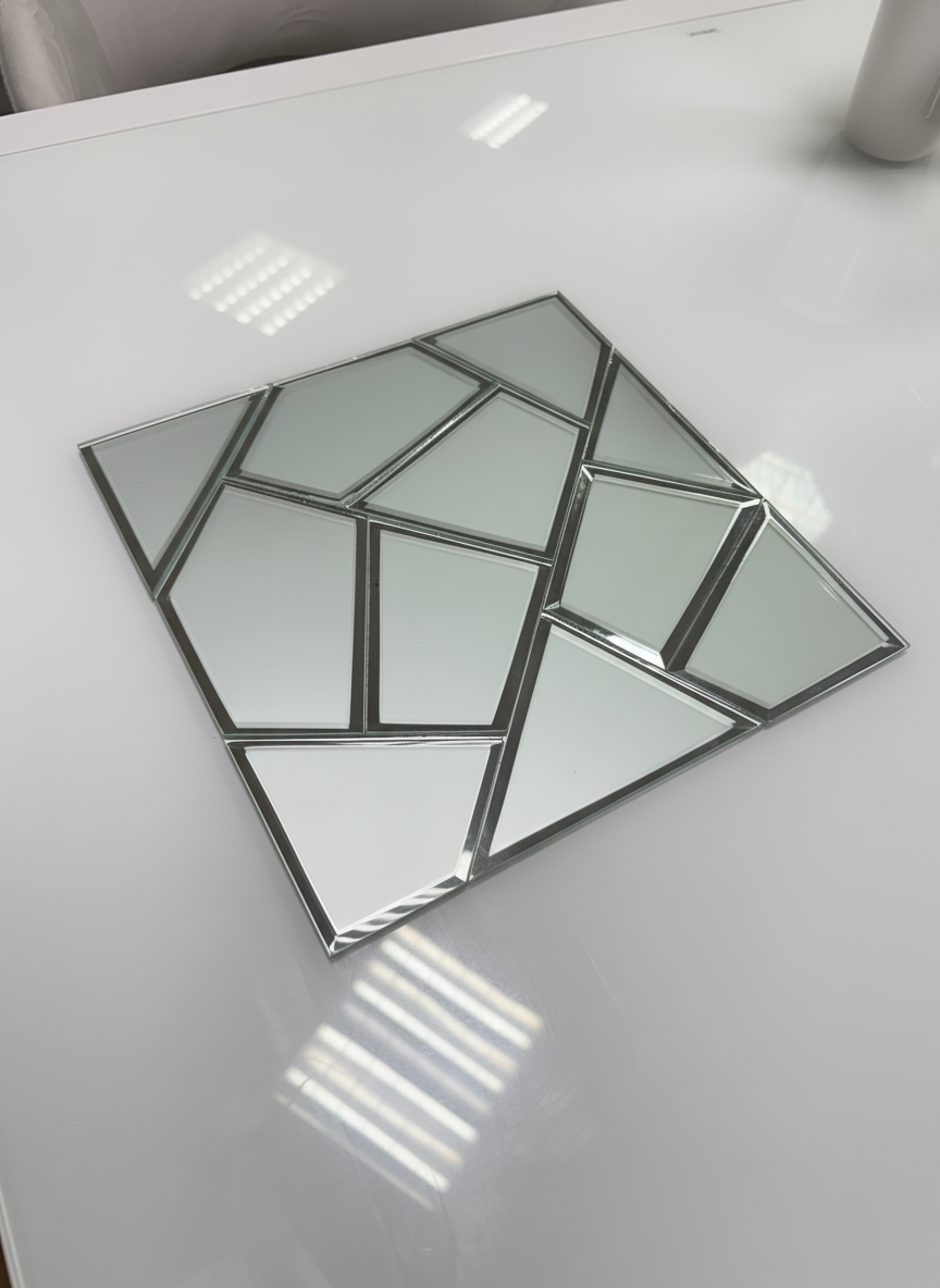 Сребрист огледален панел с полирани фасети и геометрия, която отразява светлината елегантно. Идентичен с мострата.