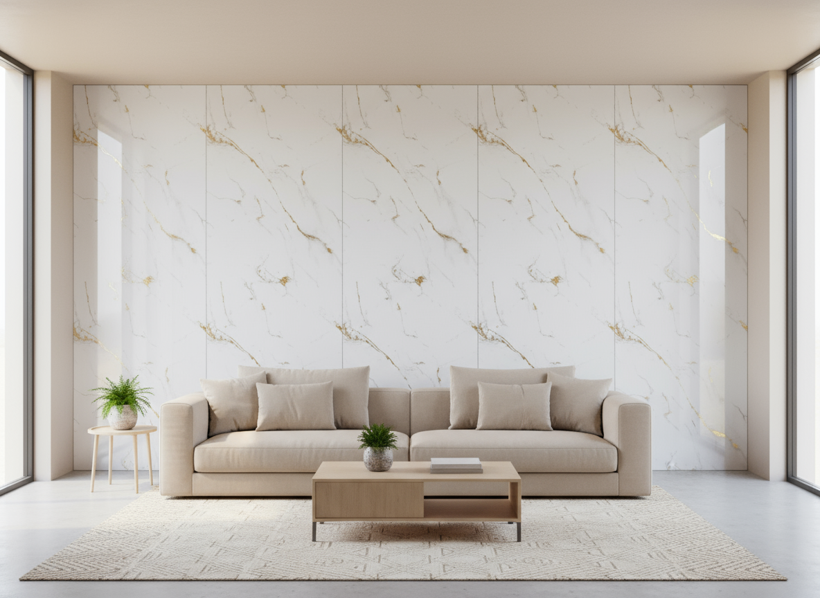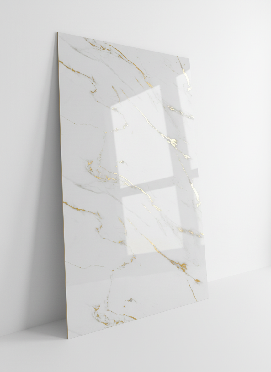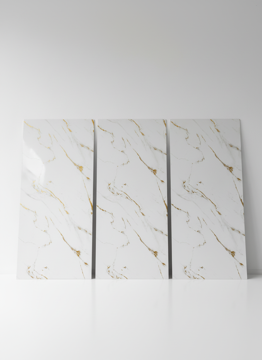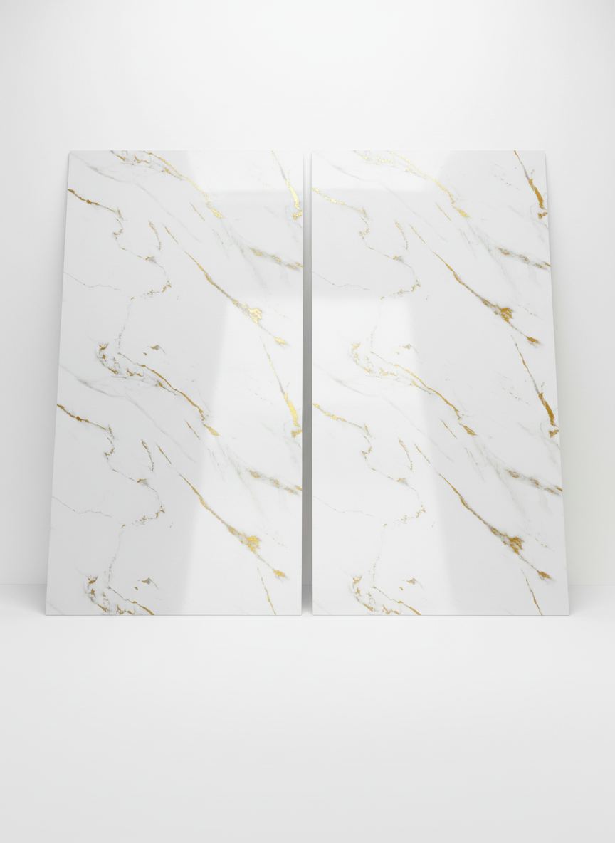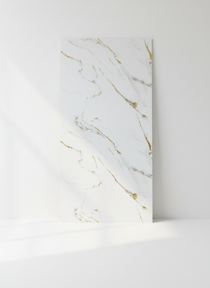 Изискан светъл десен с фини златни жилки. Размер 122 × 260 × 3 мм, гланц. Универсален за различни стилове.