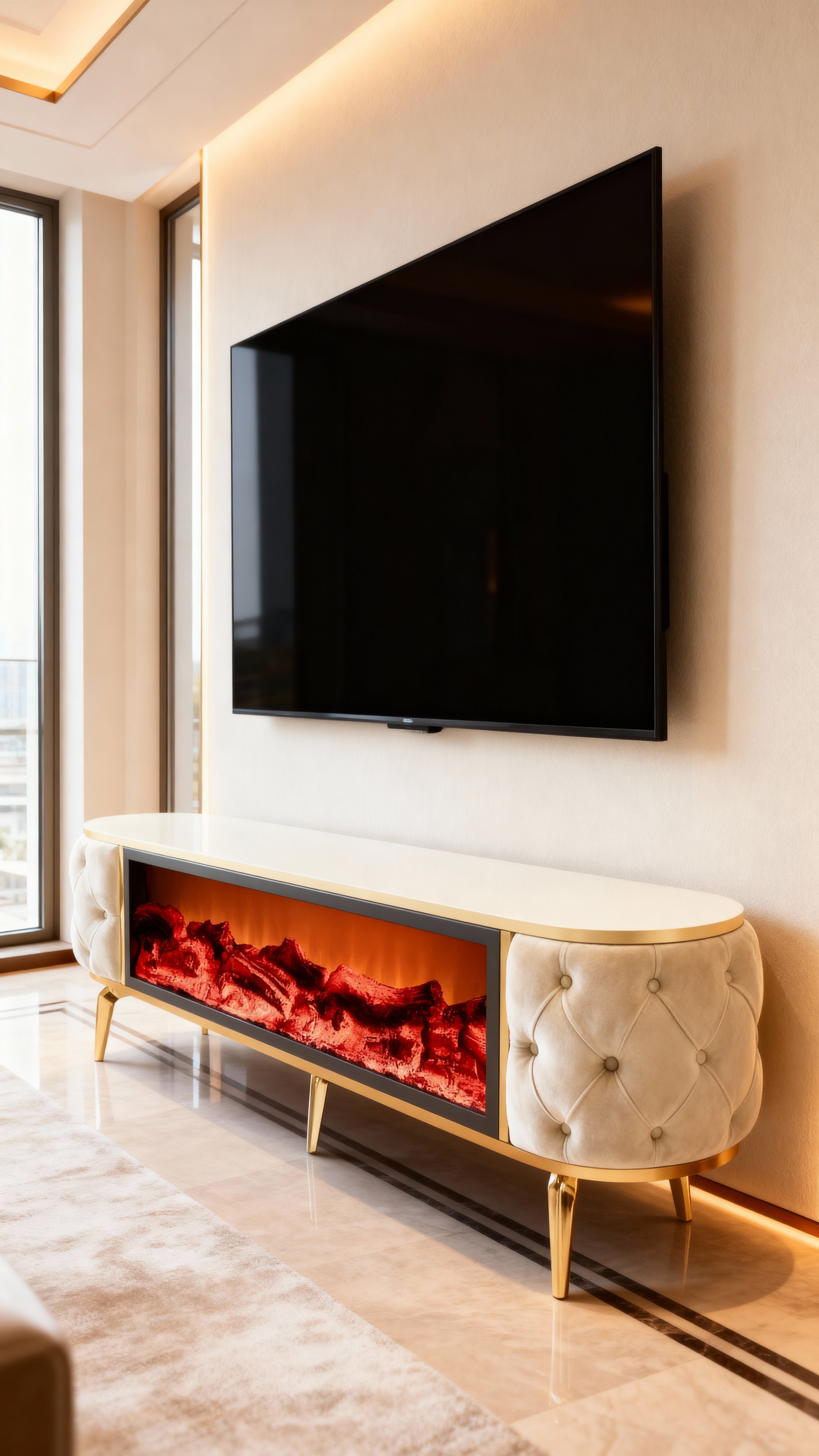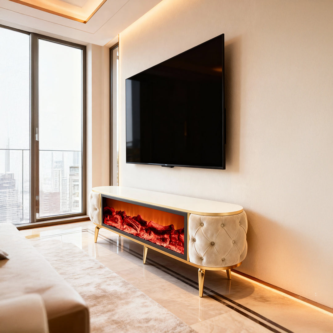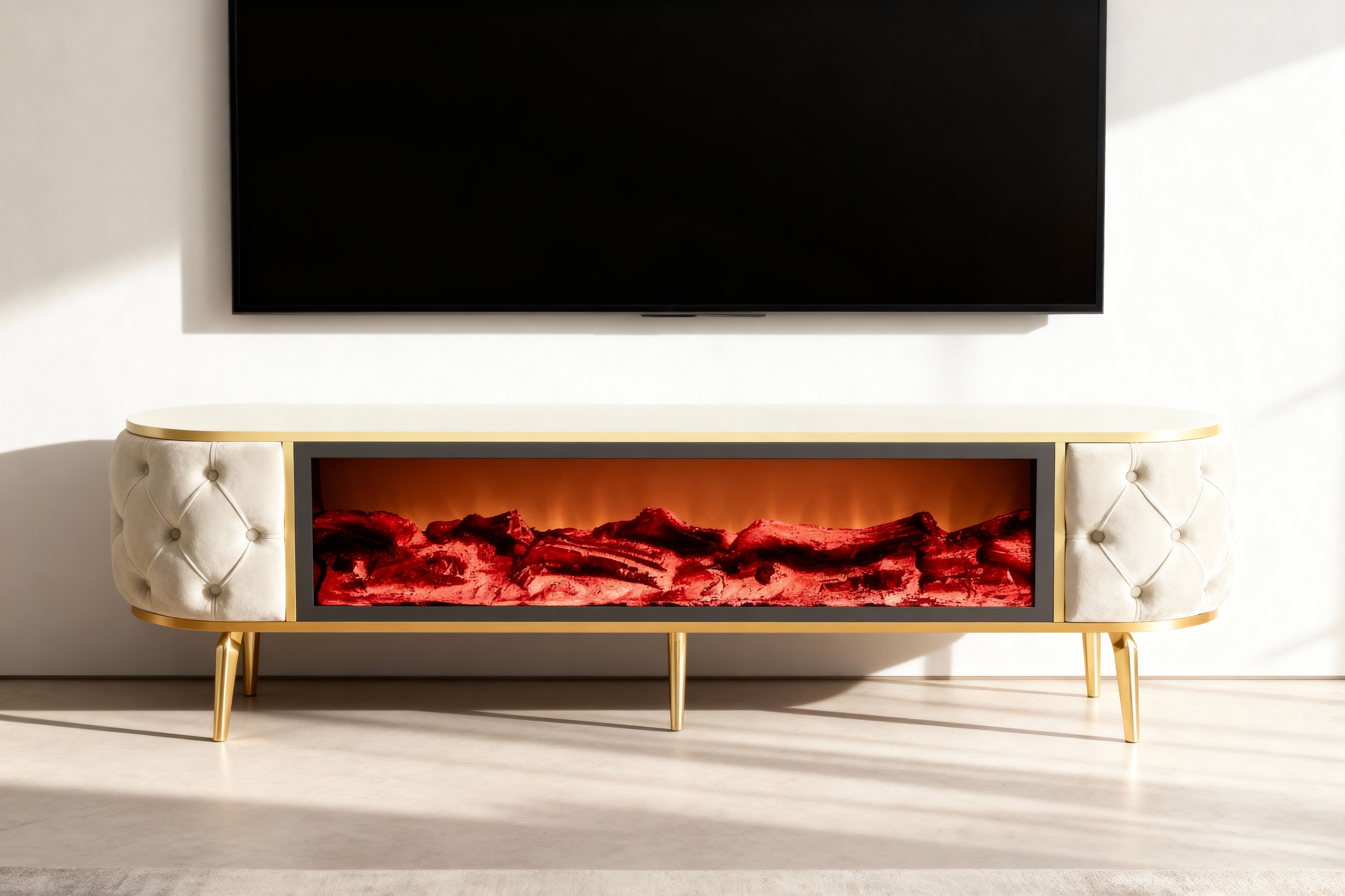 Луксозен смарт ТВ шкаф с вграден Bluetooth аудиоговорител и реалистичен LED ефект на камина. Размер 180×40×55 см. Висококачествен корпус, елегантни златни детайли, чисти линии. Идеален за модерен хол – стил, уют и функционалност.
