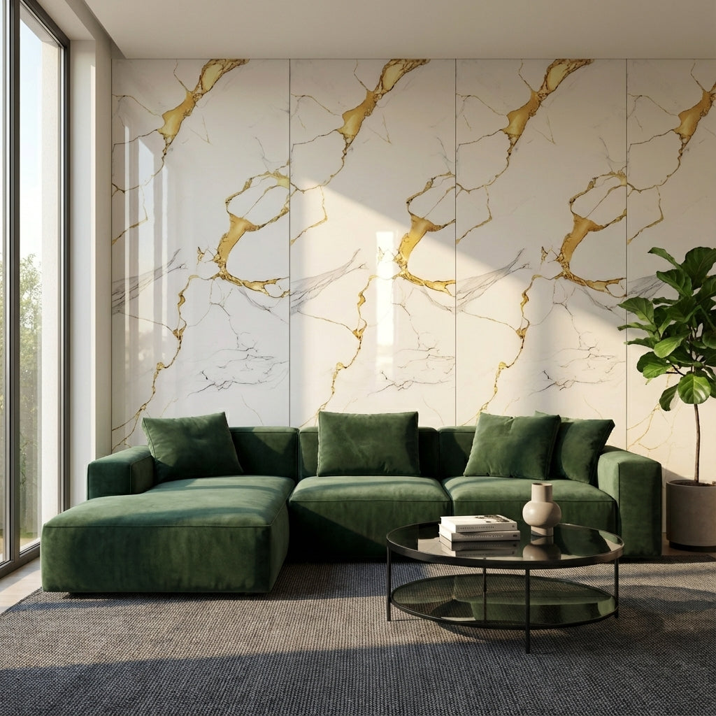 Луксозен ПВЦ стенен панел с гланцова повърхност и изразени златни мраморни вени. Размер на панела: 122 × 260 × 3 мм. Водоустойчив, устойчив на петна и лесен за монтаж без фуги. Идеален за акцентна стена в хол, спалня или офис.