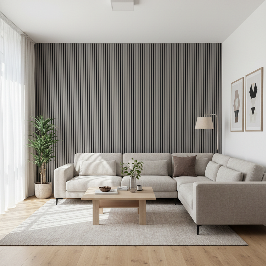 МДФ акустичен панел Сив Дъб – стилно решение за интериор с естествена визия и подобрена акустика. Ламелният дизайн с филцова подложка осигурява шумоизолация и модерен акцент във всеки дом или офис.