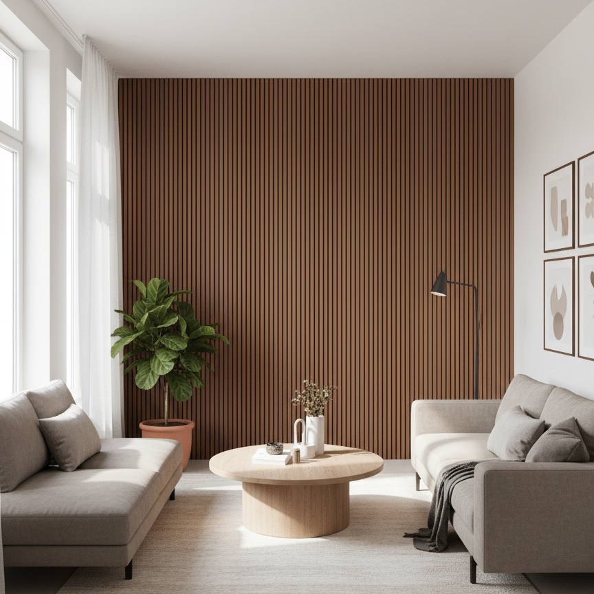 МДФ акустичен панел Кафяв Орех – топъл дървесен тон и елегантен релеф за стилен интериор. Осигурява подобрена акустика и визуален комфорт. Перфектен избор за стени, тавани и ТВ зони.