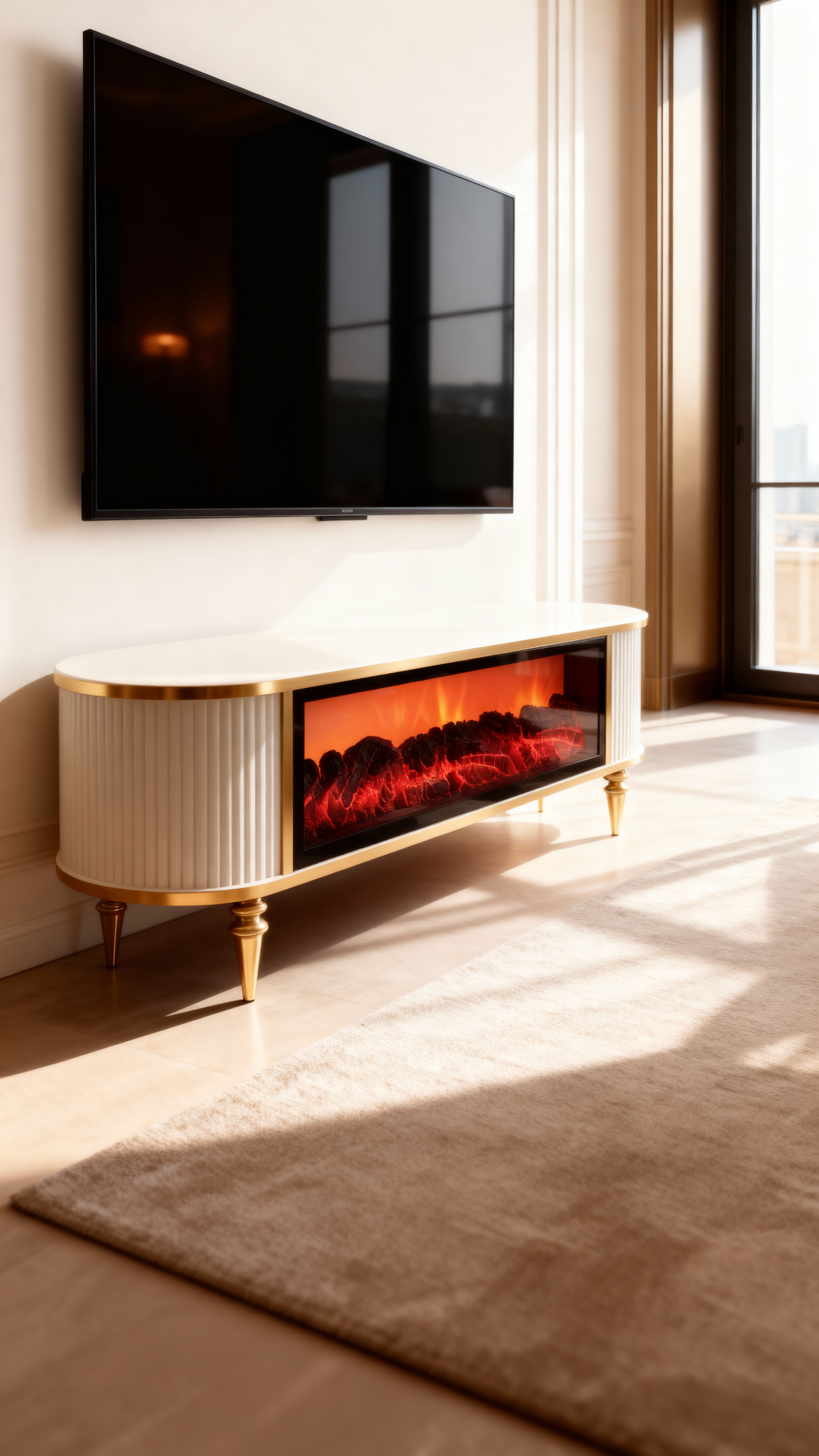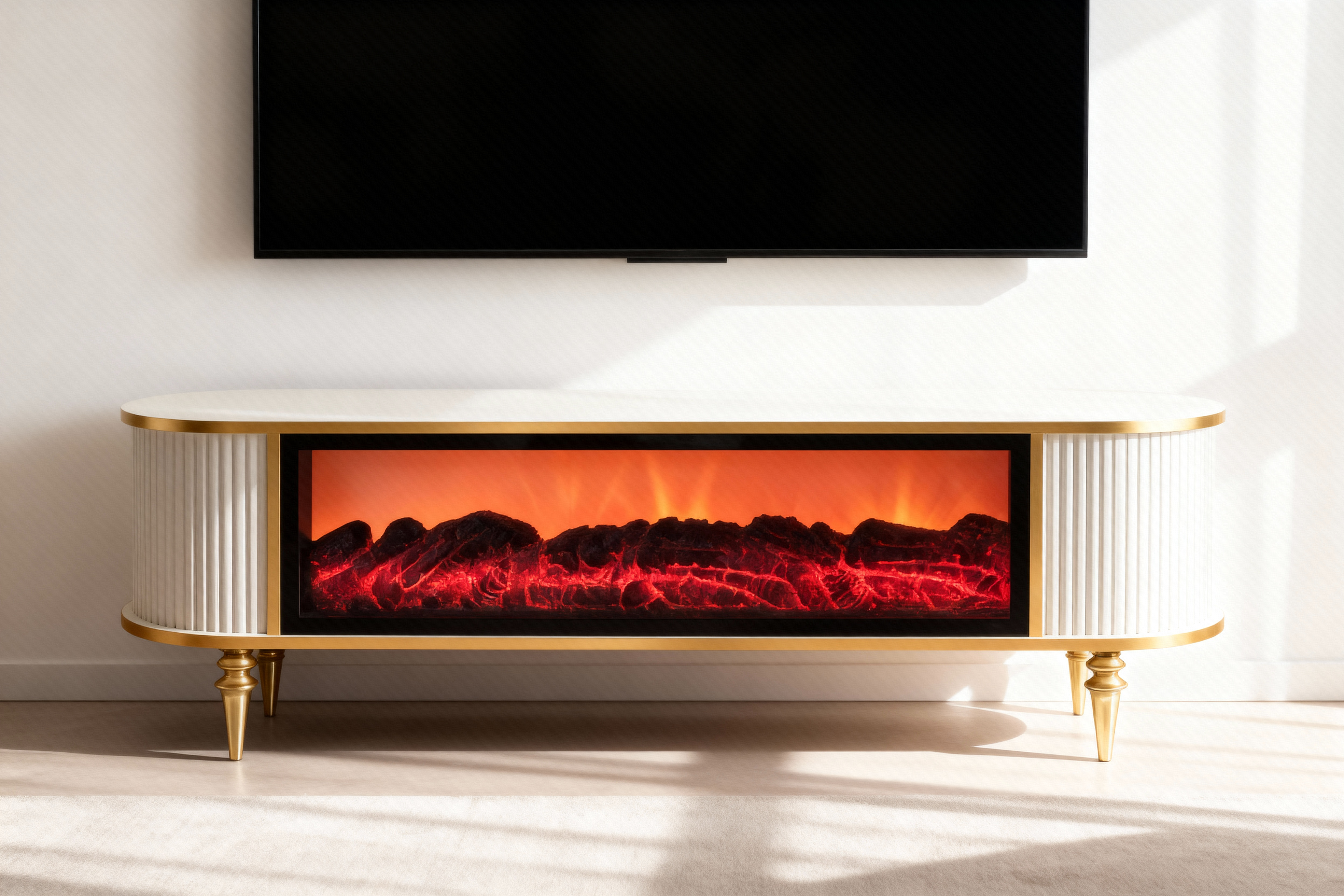 Елегантен смарт ТВ шкаф с ребрована фасада, Bluetooth аудио и LED пламък. Размер 160×38×53 см. Премиум излъчване и лесна поддръжка. Създава уютна атмосфера с модерен характер.